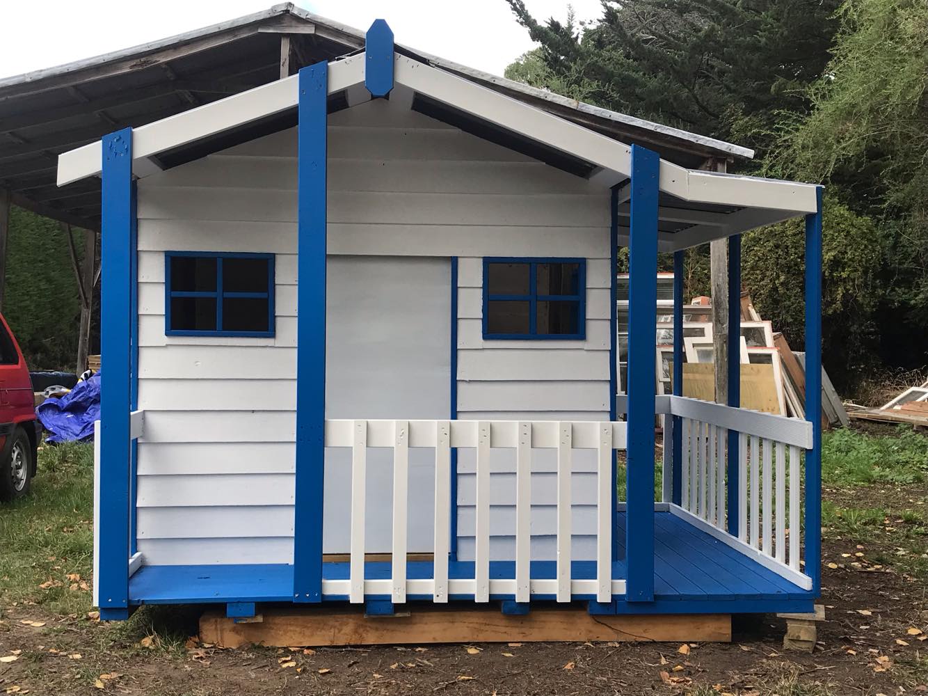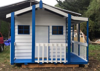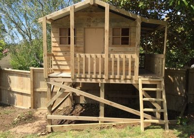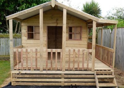 The playhouse measurements include a 600mm front deck and 600mm side deck. Playhouses do not come painted or stained.